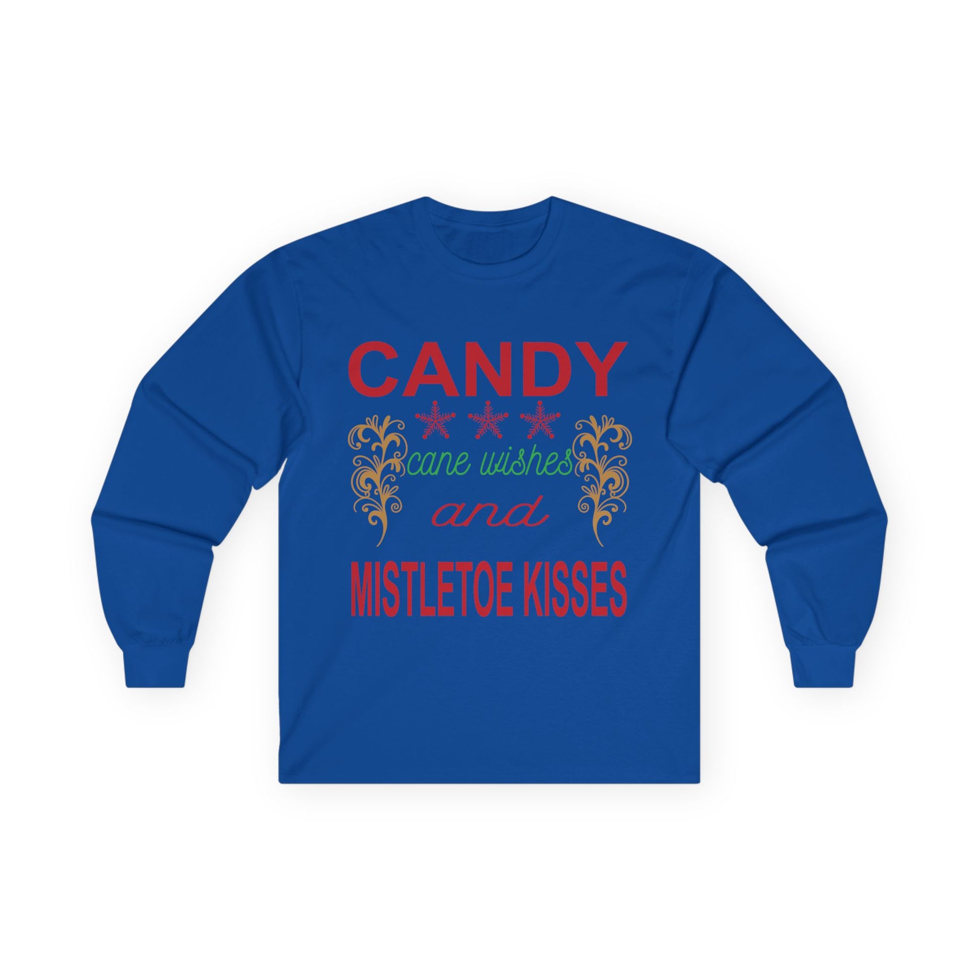Enhance your wardrobe with this charming Unisex Ultra Cotton Long Sleeve Tee, perfect for cozy, festive vibes. The cheerful design featuring 'Candy Cane Wishes and Mistletoe Kisses' brings a playful holiday spirit to your attire, making it an ideal companion for Christmas gatherings, seasonal parties, and casual family outings. Crafted from environmentally-friendly cotton, this tee gives off a vintage feel, ensuring you stay stylish while being conscious of the planet. It’s a must-have for anyone looking to celebrate the joys of the season, and offers a comfy fit for all adults. Pair it with your favorite jeans or layer under a jacket for a complete look this holiday season!
